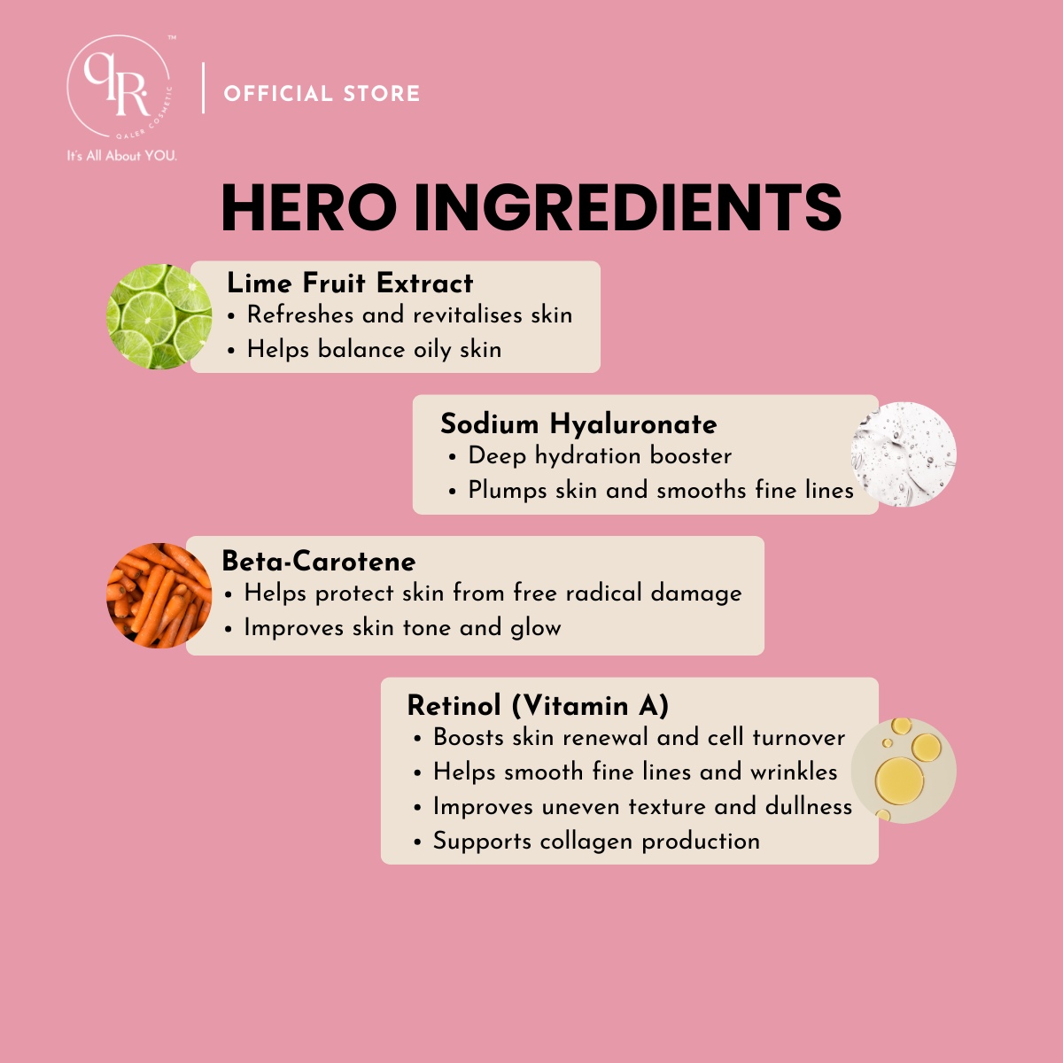 KEY INGREDIENTS: Macadamia Oil, Meadowfoam Seed Oil, Sweet Orange Essential Oil, Grape Fruit Extract, Orange Fruit Extract, Apple Fruit Extract, Lemon Fruit Extract, Lime Fruit Extract, Sodium Hyaluronate, Beta-Carotene, Retinol